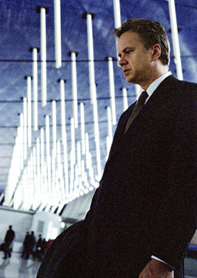 It's the future, and the melting pot theory is now reality. Civilization seems to exist in two regions; in sealed mega cities requiring permission to enter, and the 'outside.' English is the predominant language, but sprinkled throughout are snippets of others like Spanish and Mandarin (which leads to some truly clunky dialogue). Cloning and in vitro fertilization are part of the norm, which resulted in the creation of Code 46, the law that states that anybody who shares 100%, 50%, or 25% similar genetic materials may not mate. Code 46 is Michael Winterbottom's view of the future. This is science fiction at its more abstract; a movie about ideas, not necessarily about aliens and robots. The problem is that Code 46 is pretty dull. Most of this comes from the performance of its two stars, Tim Robbins and Samantha Morton. Both are gifted actors, but nearly everything here is done in a dry monotone. Robbins (Anchorman, Mystic River) is William works for a large corporation, investigating instances of identity fraud. In order to gain entrance into these large cities, people need approved 'papelles,' doled out or withheld for specific reasons. William is in Shanghai, looking into a factory where somebody is printing fake papelles. He took an empathy virus, which, in essence, allows him to read the minds of people if they tell him something about them. From his interviews, he realizes that Maria (Morton, In America, Minority Report) is the culprit. Yet, something draws her to him, and he fails to turn her in. Instead, he begins a pretty boring affair with her. Winterbottom (24 Hour Party People, The Claim) and screenwriter Frank Cottrell Boyce (24 Hour Party People, The Claim) never make clear to the viewer why William feels the way he does towards Maria. What is it about her that would make this straight-laced company man give up everything he believes in? She seems pretty ordinary is most aspects, aside from the fact that she counterfeits identity papers for strangers. Both are lacking in the personality department. It feels like Winterbottom and Boyce wanted to make a movie about free will, and used the idea of Code 46 as a backdrop for their ideas on love and free will. It turns out that William and Maria are in violation of Code 46, which sets off a chain of events that are just as boring as they are. Despite attempts by everybody to keep them apart, William tries as hard as he can to make his way to Maria. His love for her is strong enough that he is willing to violate legal and societal norms to be with her. The depth of the story never really goes beyond this. Winterbottom doesn't really explore the ramifications of their relationship, or anything beyond the fact that they love each other. Code 46 feels like a first draft of a film, where the basic shell of a story is laid out, but still needs a lot of work. The one really nice aspect of this movie is that Winterbottom cast his film internationally, with many familiar faces and highly esteemed foreign (especially Asian and Indian) actors taking some small roles. So while Winterbottom's future may be multinational, it's not that exciting. |