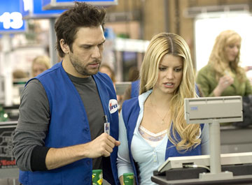 People suspected it in The Dukes of Hazzard, and Employee of the Month confirms it - Jessica Simpson cannot act. She has a great voice, and a greater body, which the movie shows off often with a series of tight, low-cut shirts and sweaters. But her acting ability is minimal at best, often wooden and unemotional. Simpson delivers her lines with a minimum of emotion, often looking uncomfortable and stiff. Thankfully, she doesn't have many stretches that require her to say more than one sentence at a time, but the result is still a deadening thud. Simpson kills every scene she is in, sucking any sense of life out of it. Her co-star, Dane Cook (London, Waiting...) fares much better. Cook sprang to stardom using MySpace to promote himself as a stand-up comedian. Although he's had small roles in other films, this is his first starring role. How does he do? Well, he's okay. Nothing particularly impressive emerges. Cook doesn't come across as anything special. But a large part of this is due to Don Calame, Chris Conroy, and Greg Coolidge (Sorority Boys), who came up with the story and the script. Employee of the Month is a comedy that isn't funny, with a small romance that isn't romantic. It takes an idea (a lazy guy and his friends working at Costco) then beats it to death. Cook is Zach Bradley, a Costco employee for the past decade. He and his slacker friends are happy as box boys, the "lowest of the low" in the employee hierarchy. They sit around and waste time, and generally get by in life. Until the arrival of Amy (Simpson), who, Zach learns has a thing for the Employee of the Month. Unfortunately for Zach, he is not a model employee. This role belongs to Vince (Dax Shephard, Idiocracy, Zathura), a preening cashier who lords his superiority over everybody. Vince has been Employee of the Month a record 17 times, and if he wins it one more time, he also wins a brand new car. Vince also sets out to woo Amy (albeit badly), and a battle for Amy and the title ensues with Zach. Like every story of this nature, the easygoing, loyal Zach forgets his friends as he begins to win Amy and as he escalates his juvenile war with Vince. Employee of the Month drags on even as it tries to pace itself quicker. Each day has a winner, and at the end of the month, the person with the most days wins. Vince takes a bit more then the first week. Then Coolidge (who also directed) has to slow things down so that there can be more of a contest between the two guys. Zach needs to slowly learn how to be a better employee, woo Amy, and in between there are all sorts of pranks, some amusing and some not. But Zach is too much of a nice guy, Amy too hot, and Vince too arrogant. Everybody comes off as extremely fake, so by the time the movie reaches its climax, nobody cares anymore. |